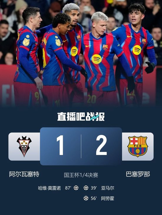 直播吧2月4日讯 北京时间2月4日凌晨4时整,2025-26赛季国王杯1/4决赛在比莫迪球场展开角逐,巴塞罗那客场对阵阿尔瓦塞特。上半场亚马尔连场破门,德容助攻,下半场阿劳霍收获回归首球,拉什福德角球助攻,哈维·莫雷诺扳回一城。最终巴塞罗那客场2-1战胜阿尔瓦塞特晋级国王杯四强,巴萨取得各赛事5连胜。